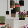 Lámparas de suspensión Colibrí diseñadas por Let’s Pause que evocan la singularidad de este pájaro y la delicada mezcla de tonos que muestran las diferentes especies que existen alrededor del mundo. Tejidas a mano con fique.